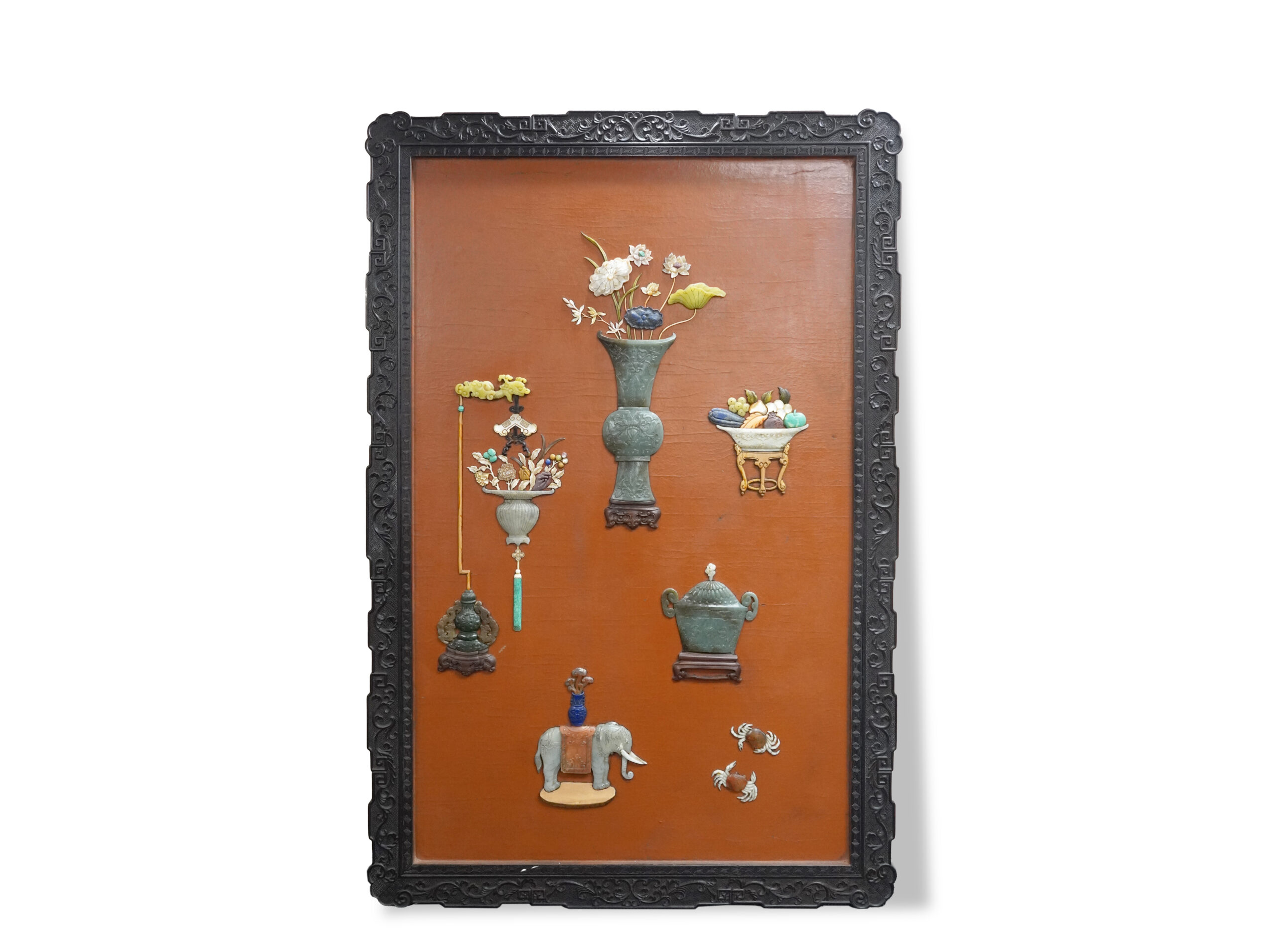 Chinese heavy rosewood jade insert hanging panel. The late 19th century during the late Qing dynasty, with carved jade insert into the orange background hanging panel. These were made for the wealth and possibly Chinese royalties as part of decorative art for their residence.