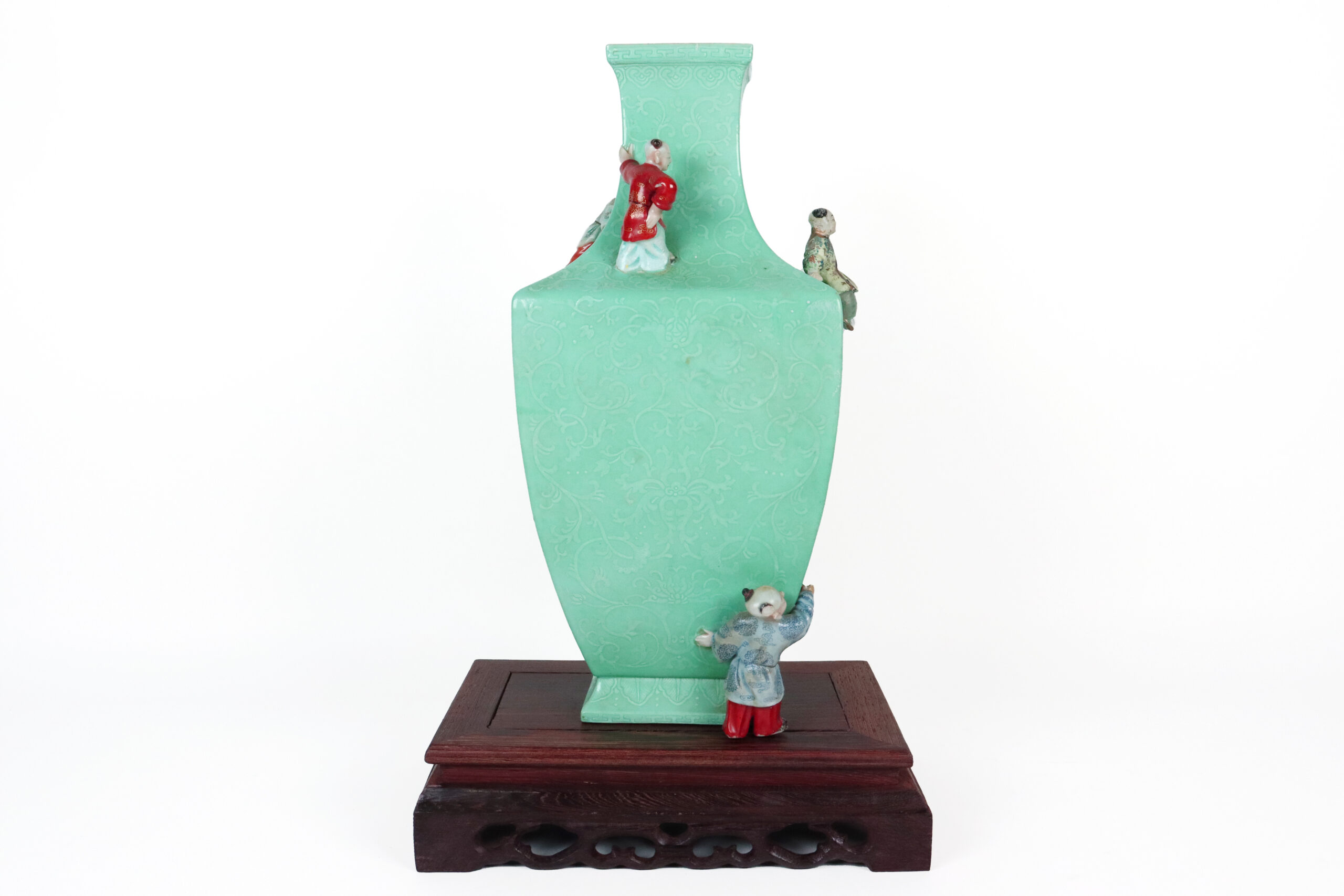 Chinese Qianlong 18th century turquoise glazed with floral motif and children character fine vase